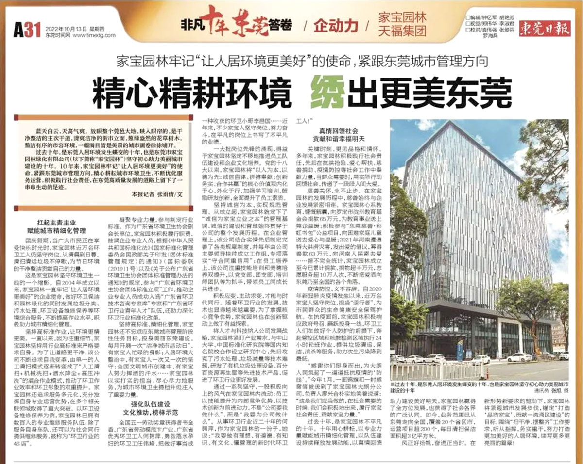 为迎接党的二十大胜利召开,本月,东莞日报开展“奋进新征程 建功新时代——党的二十大大型主题宣传”,10月13日,在“非凡十年 东莞答卷”系列中,以“精心精耕环境 绣出更美东莞”为标题报道了家宝园林的十年蝶变,文章从精细化作业、企业文化、队伍建设、专业水平、构建和谐等方面展现家宝园林的责任担当和务实重干精神。