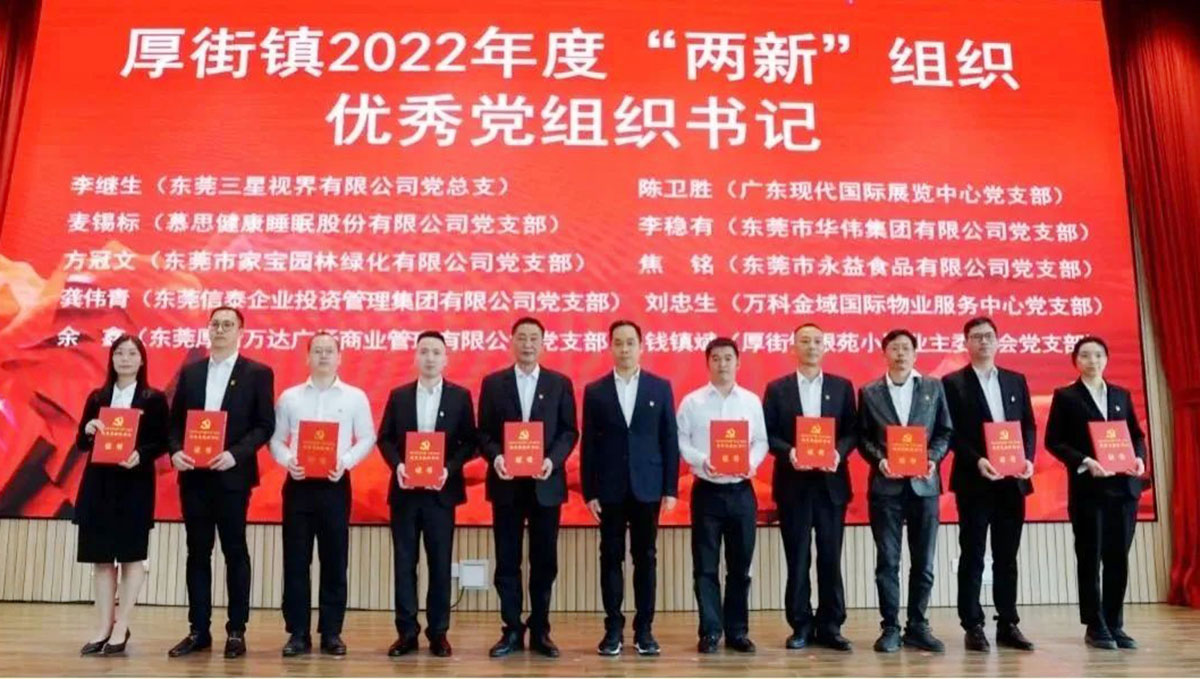 会议对2022年度先进“两新”组织党组织和优秀党组织书记进行表彰,其中,东莞市家宝园林绿化有限公司党支部荣获“厚街镇2022年度‘两新’组织先进党组织”称号。