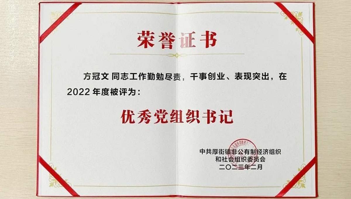 东莞市家宝园林绿化有限公司党支部书记方冠文被评选为“厚街镇2022年度优秀党组织书记”。通过表彰以激励全镇“两新”组织党组织和广大党员、党务工作者在推进经济社会高质量发展中奋发进取、建功立业。