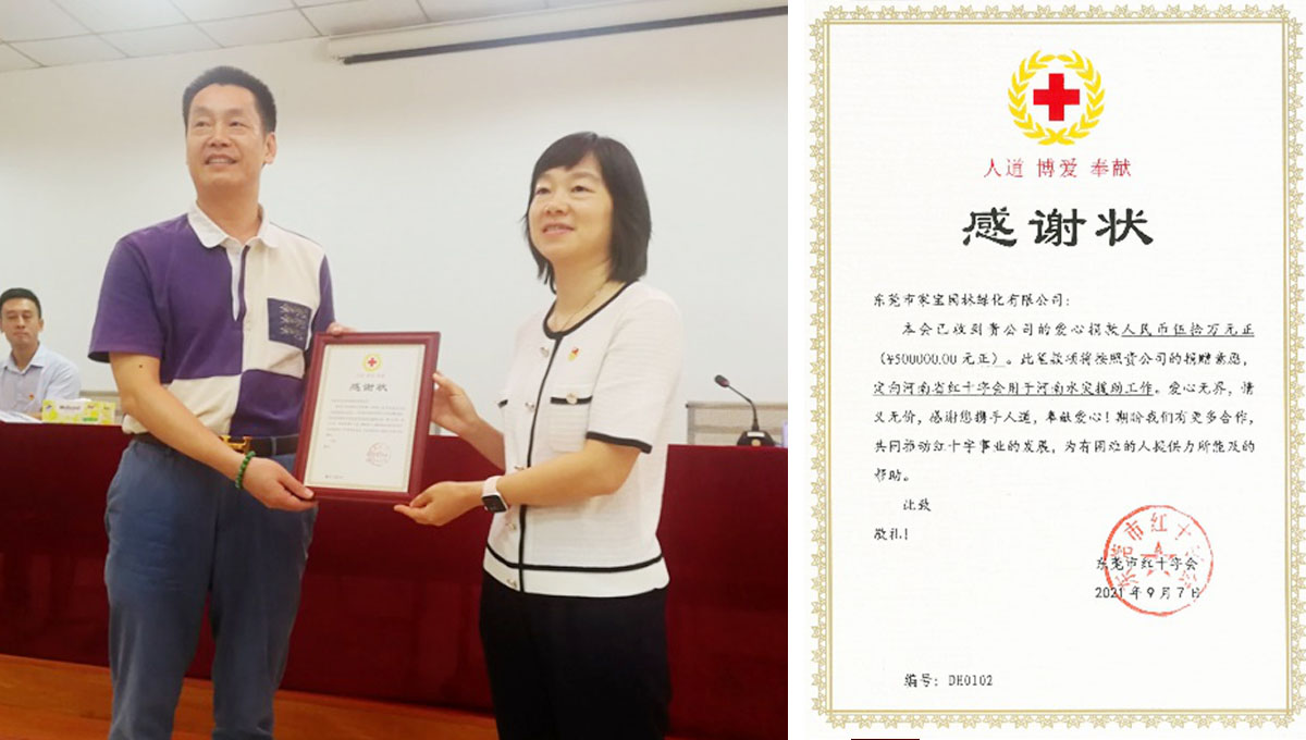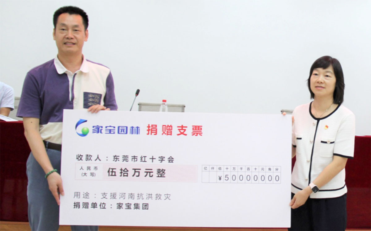 家宝,是慈善的“熟面孔”,在敬老爱老、捐资助学、爱心帮扶、公益宣传方面无一缺席。今年,河南省遭受百年不遇的特大洪涝灾害,家宝集团再次慷慨解囊,通过东莞市红十字会向河南人民寄去“家宝人的祝愿”。