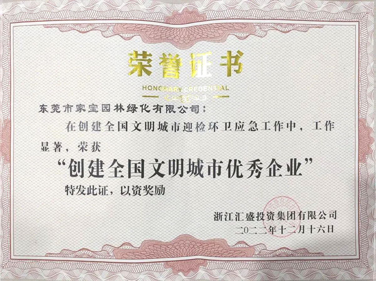 近日,家宝园林在浙江省衢州市2022年度创建全国文明城市迎检环卫应急工作中表现突出,得到了当地政府和甲方单位的一致肯定,荣获“创建全国文明城市优秀企业”称号。
