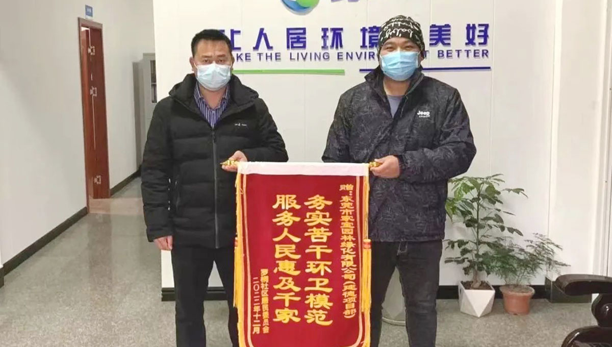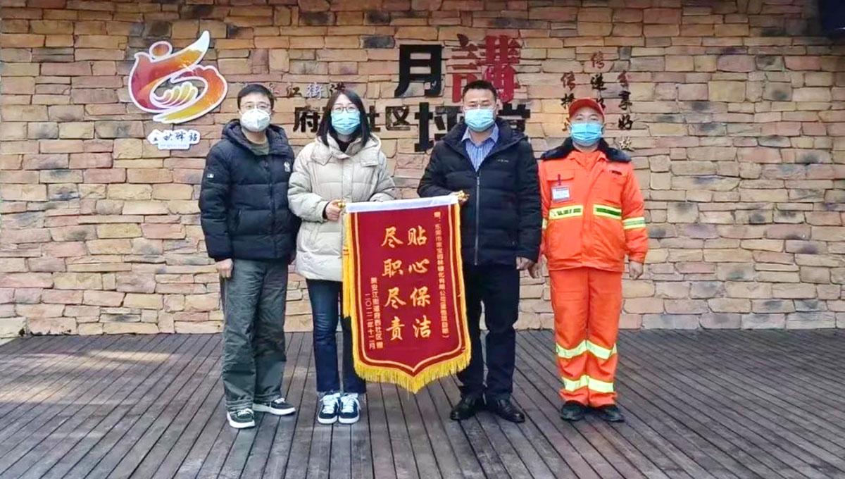 12月29日,浙江省建德市新安江街道罗桐社区党群服务中心主任唐健浩向家宝园林浙江建德项目送来一面写有“务实苦干环卫模范 服务人民惠及千家”字样的锦旗,对家宝园林在卫生迎检、创文创卫工作中的突出贡献给予肯定。