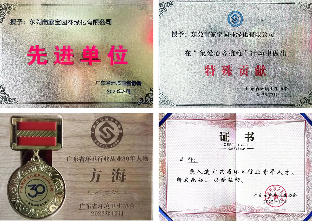 大会对全省先进、优秀的单位和个人进行了表彰,其中,东莞市家宝园林绿化有限公司荣获广东省“先进单位”、“信用等级AAAAA级企业”,并被授予“集爱心齐抗疫行动特殊贡献”荣誉称号,员工欧群获评“广东省环卫行业青年人才”、方海获评“广东省环卫行业从业30年人物”殊荣。