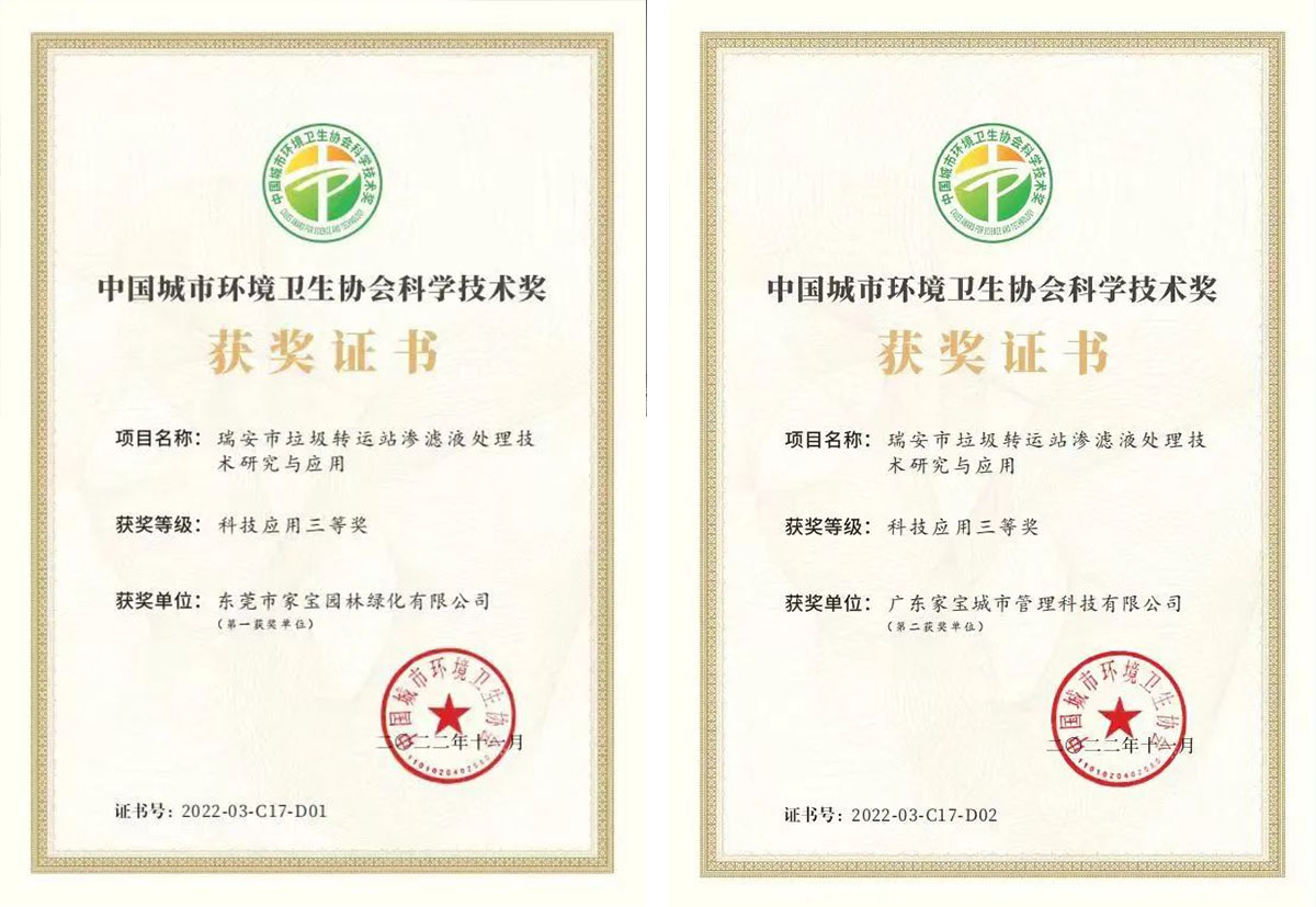 “瑞安市垃圾转运站渗滤液处理技术研究与应用”是由东莞市家宝园林绿化有限公司、广东家宝城市管理科技有限公司自主研发,荣获2022年度中国城市环境卫生协会“科技应用三等奖”。