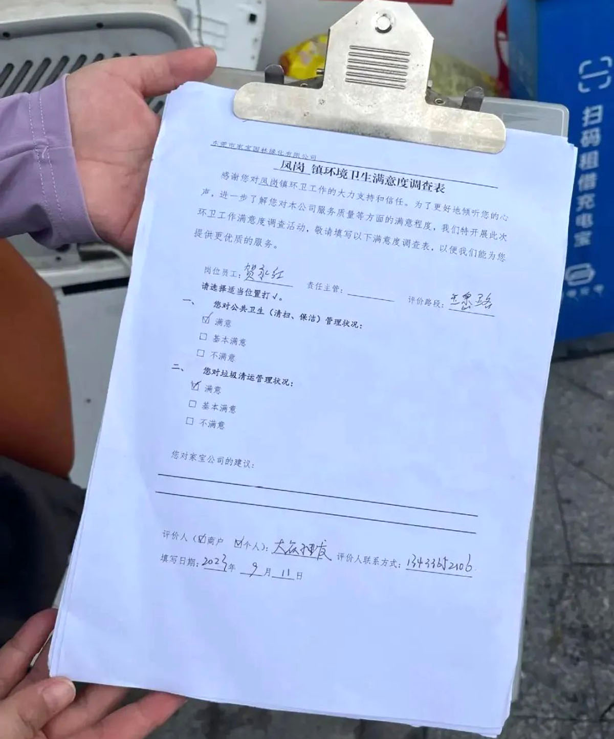 “通过问卷,我们就能了解大家对环卫工人的评价,掌握环卫工作中存在的问题并及时做出调整和改进。”据凤岗项目部项目经理李柳军介绍,除了发放满意度调查表,项目部还引导环卫工人做好服务,积极传递温暖。“服务做好了,人与人之间的信任就建立起来了,群众对环境卫生的态度才能从‘要求、期望’转变‘支持、关心’。”李柳军如是表示。