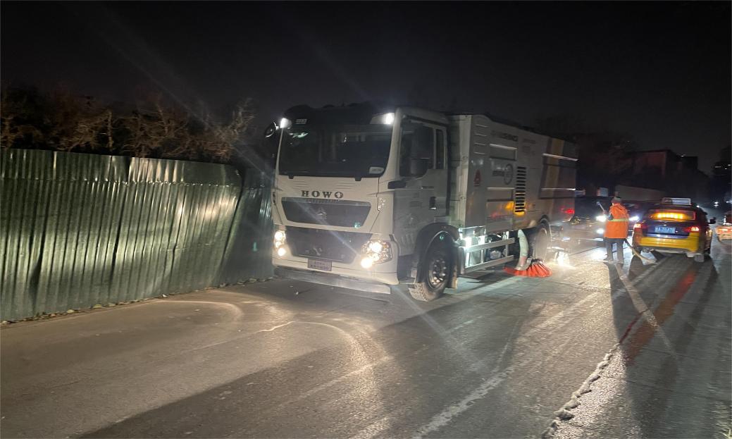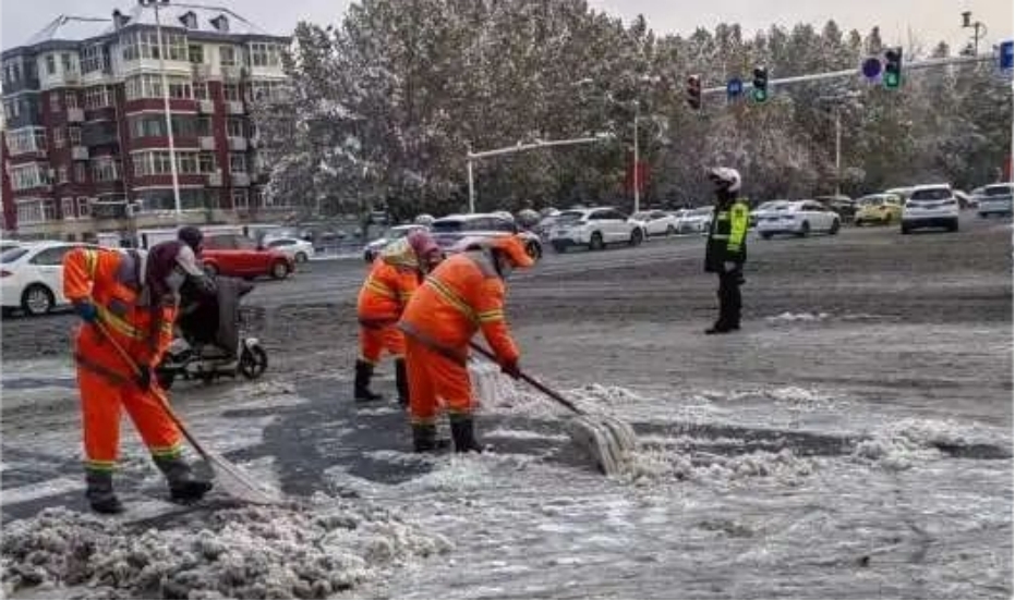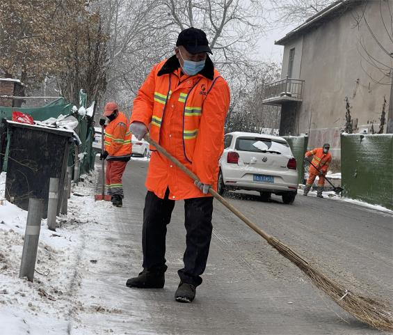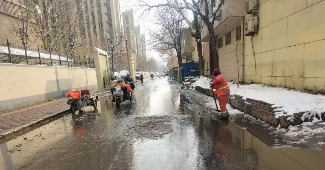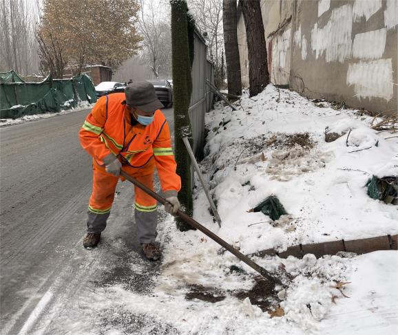 主干道的清雪除冰结束后,环卫工人则来到背街小巷、十字路口等部位,加强人工动态巡回清雪频次,对积雪相对较厚结冰较为严重的重点路段,增派人员,加快人工清雪除冰进展,做到持续、全面、彻底除雪,大家在清雪的同时,加大落叶清理力度,防止落叶附着路面。