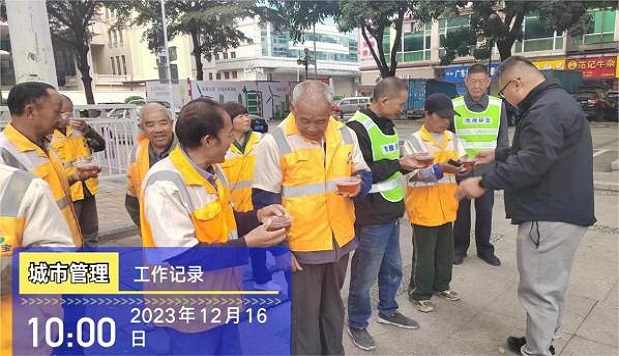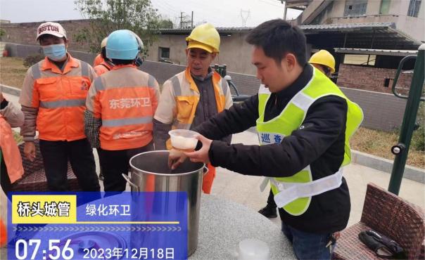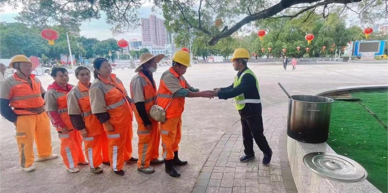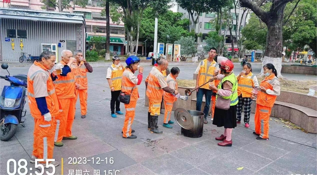 受冷空气影响,12月15日,广东东莞发布入冬以来首个寒冷黄色预警信号,周末气温从最高27℃骤降至最低7℃,仿佛一夜入冬,如此大的温差,很多市民穿上了羽绒服御寒。考虑到一线环卫工人需要在户外作业,家宝园林东莞塘厦、沙田、厚街、清溪、凤岗、桥头、常平等项目相继开展关爱员工工作,一大早就将熬制好的姜茶送到各项目现场,大家端着热气腾腾的姜茶,甜在口中暖在心里。