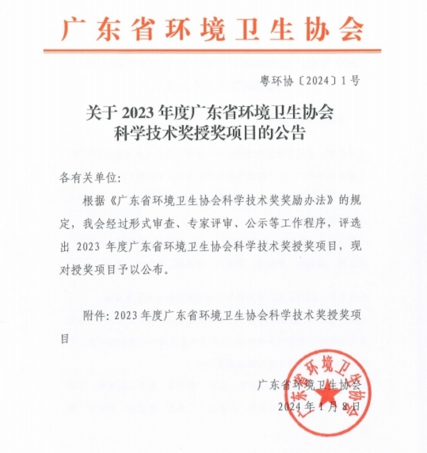 1月8日,广东省环境卫生协会发布《2023年度广东省环境卫生协会科学技术奖授奖项目》公告,根据《广东省环境卫生协会科学技术奖奖励办法》的规定,经过形式审查、专家评审、公示等工作程序,评选出2023年度广东省环境卫生协会科学技术奖授奖项目。
