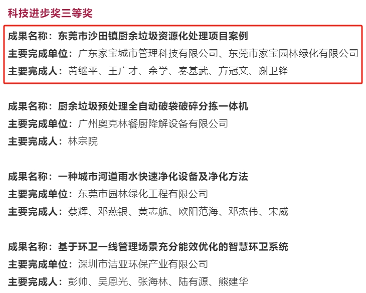 其中,广东家宝城市管理科技有限公司、东莞市家宝园林绿化有限公司联合研发、设计、投建、运营的东莞市沙田镇厨余垃圾资源化处理项目案例脱颖而出,荣获广环协科技进步三等奖。