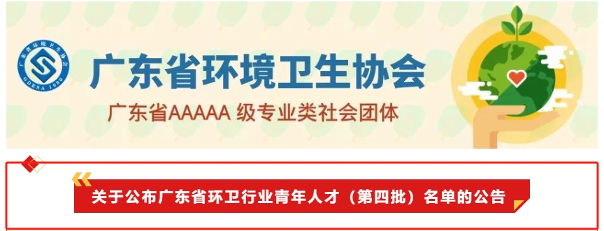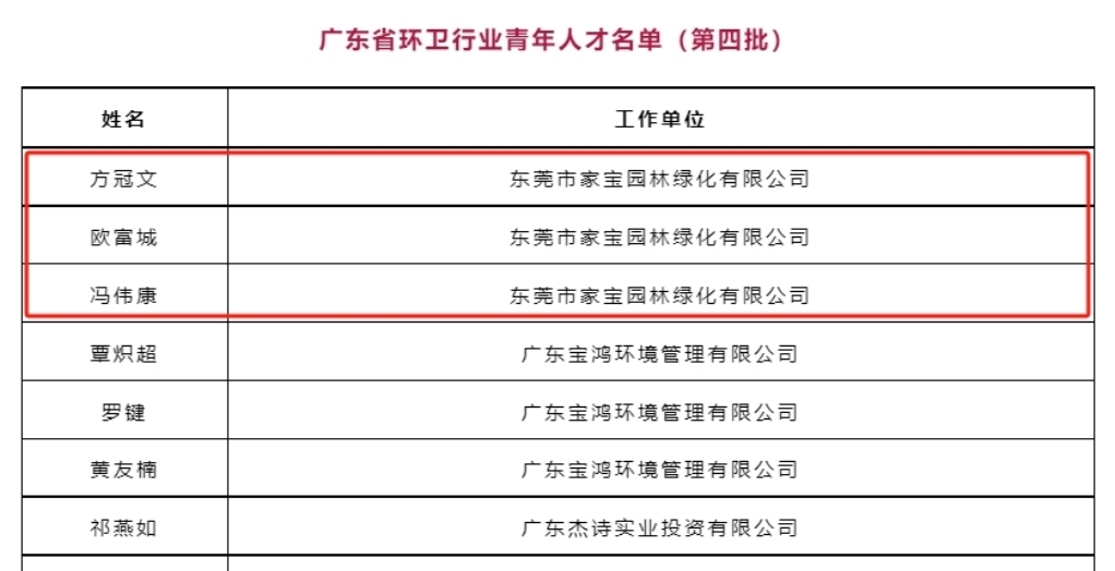 为继续发挥环卫行业青年人才的重要作用,促进广东环卫行业健康发展,按照《广东省环卫行业青年人才库管理办法》有关规定,经综合评价遴选,近日,广东省环境卫生协会发布《广东省环卫行业青年人才(第四批)名单》公告,其中,东莞市家宝园林绿化有限公司方冠文、欧富城、冯伟康被评为“广东省环卫行业青年人才”荣誉称号。