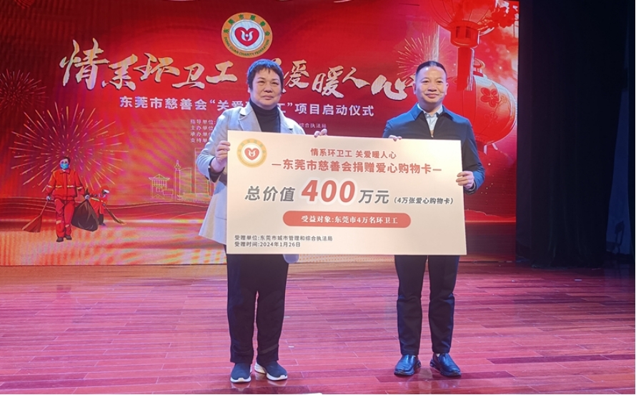 1月26日,以“情系环卫工、关爱暖人心”为主题的东莞市慈善会“关爱环卫工”项目正式启动,向奋战一线的环卫工人送上新春问候和祝福,感谢他们为建设美丽东莞所付出的辛勤劳动,营造全社会关爱环卫工人的良好氛围。本次活动由东莞市民政局、东莞市城市管理和综合执法局指导,东莞市慈善会主办,东莞广播电视台承办。