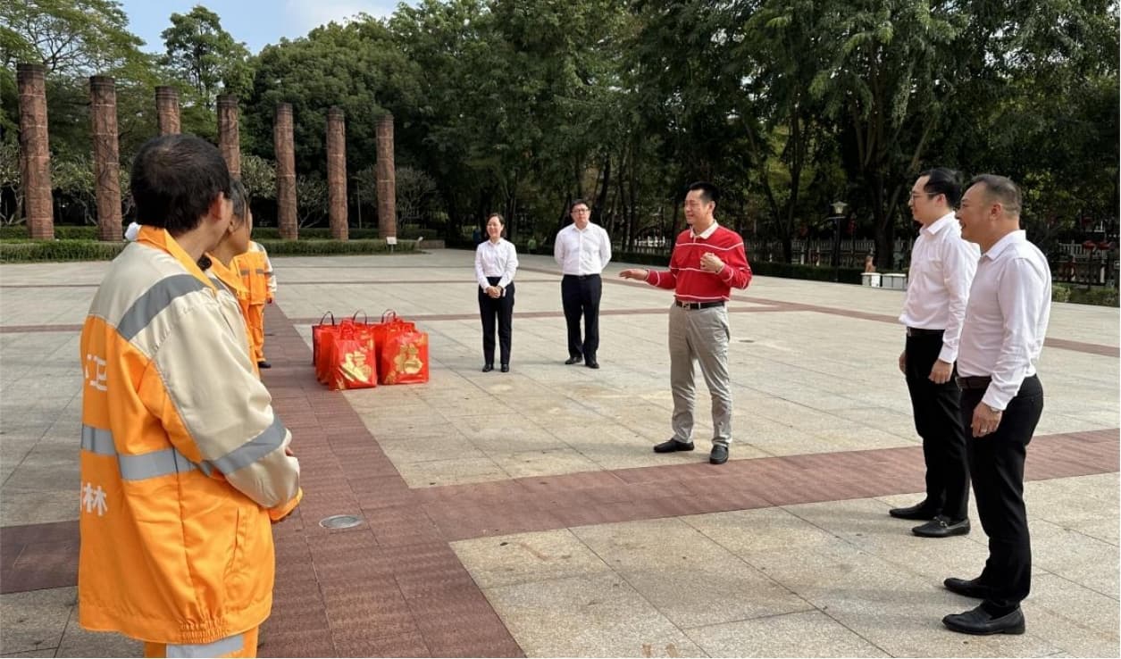 2月1日,在家宝园林东莞沙田项目的龙舟公园作业现场,集团总裁王大樑、集团党支部书记方冠文向困难员工和东莞市五一劳动奖章获得者夏军豪、冉元表达了春节祝福,并为大家送上慰问品。