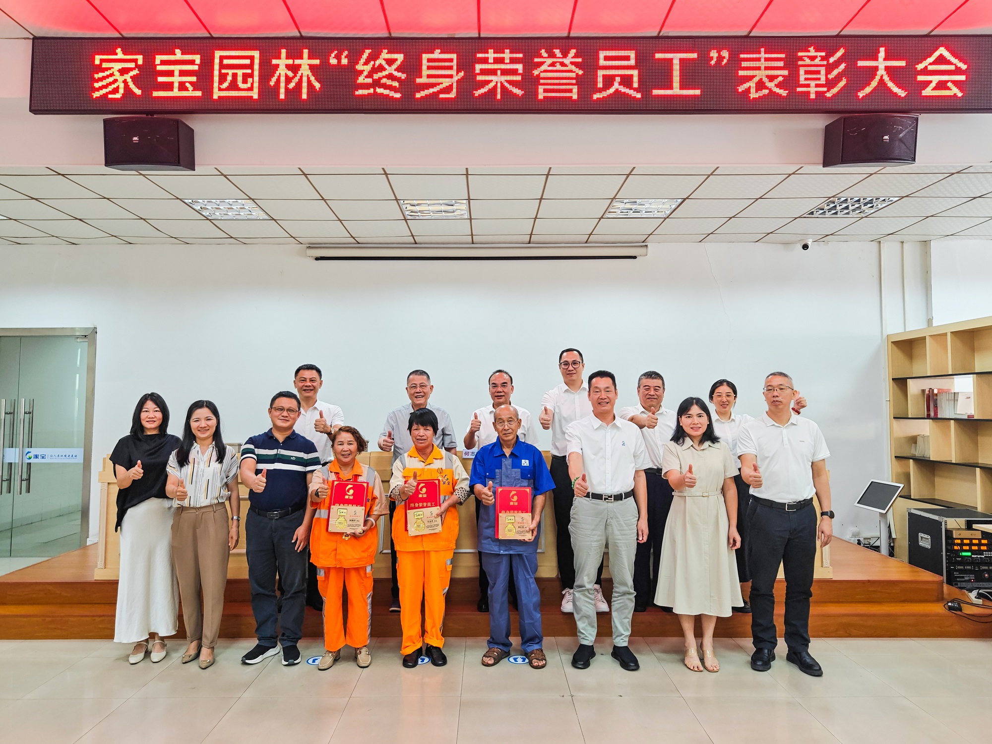 会上,家宝集团总裁王大樑回顾了家宝园林二十年发展历程中的挑战与成绩,并向长期以来对家宝园林给予无私帮助和支持的各级政府、工会及协会表达衷心感谢。并表示:“以人为本”和“拼搏奉献”是家宝园林的核心价值观,今天公司授予韦金香、何拥萍和刘宏贵三名员工“终身荣誉员工”称号,除了感谢他们一直以来的辛勤工作和甘于奉献,同时也将他们作为标杆榜样激励全体员工,相信公司还会有更多优秀的员工陆续涌现,公司亦会提供机会,为员工打造温暖的港湾和更大、更好的成长平台。