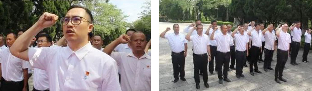 烈日下,党员们齐举右手,紧握拳头,凝神屏气,面向党旗,用洪亮的嗓声重宣入党誓词,重拾入党赤诚,重忆入党初心。“我志愿加入中国共产党,拥护党的纲领,遵守党的章程,履行党员义务......”